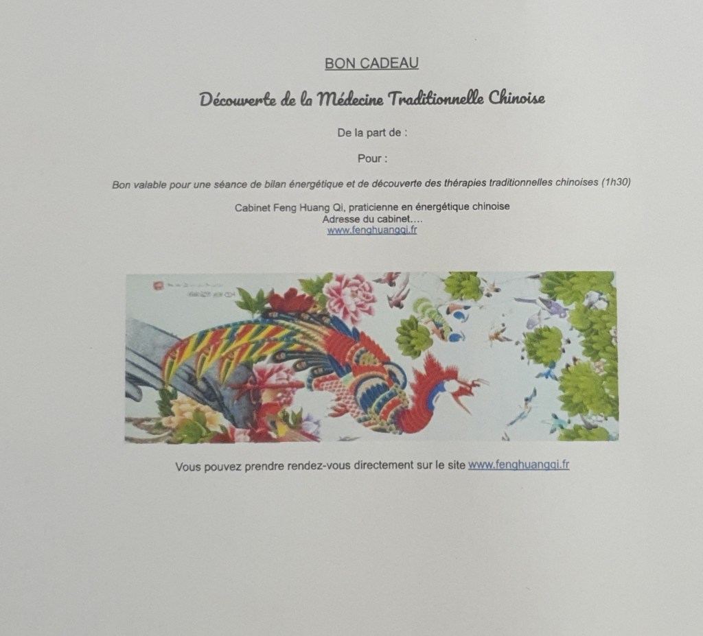 Faites plaisir à vos proches, offrez leurs un bon cadeau d’une valeur de 50 euros pour découvrir la Médecine Traditionnelle Chinoise : séance d’1h30 avec un bilan énergétique puis découverte d’un ou des outils de la MTC (auriculothérapie, réflexologie plantaire, Tui na, acupuncture… HORS drainage lymphatique)